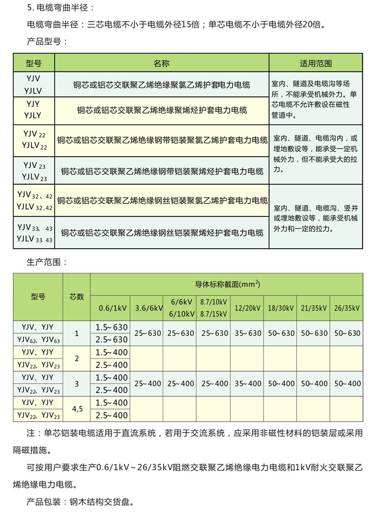 二、使用范圍 本產(chǎn)品適用于配電網(wǎng)、工業(yè)裝置等領(lǐng)域,用于固定敷設(shè)在交流50HZ、額定電壓0.6/1kv的電力輸配電線路上,主要功能是輸送電能。本產(chǎn)品為通常條件下使用的產(chǎn)品,不適用一些特殊條件的場(chǎng)合,如架空、水下、船底、海底、核電站等。