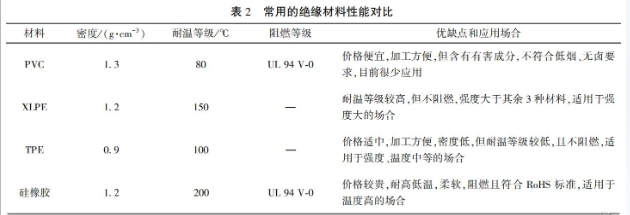 電動汽車內部環(huán)境復雜,在選用絕緣材料時,一方面要保障好絕緣層的安全使用,另一方面盡可能選擇易加工和使用廣泛的材料。目前常用的絕緣材料有聚氯乙烯(PVC)、交聯(lián)聚乙烯(XLPE)、硅橡膠、熱塑性彈性體(TPE)等,其主要性能見表2。