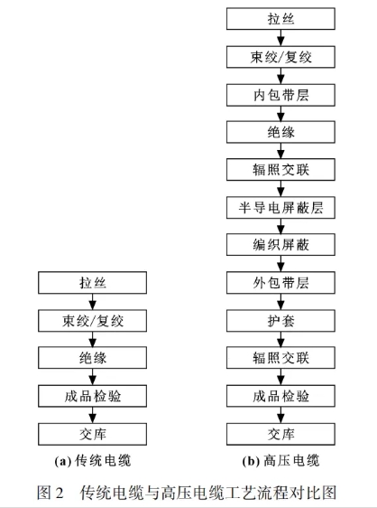 目前,電動汽車用高壓電纜的發(fā)展迅速,對應的成型工藝也與傳統(tǒng)電纜的成型工藝大有不同,兩種工藝流程對比如圖2所示。