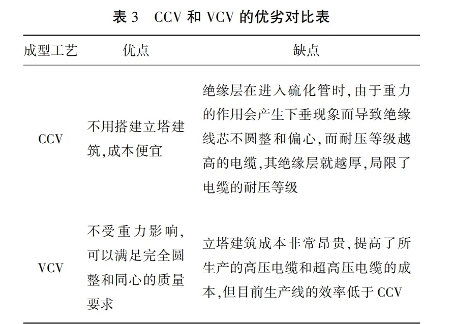 對于高壓XLPE電纜的生產基本采用懸鏈式干法交聯(lián)(CCV)和立塔式干法交聯(lián)(VCV)兩種成型工藝,實際上兩種工藝生產的電纜都存在交聯(lián)不充分等問題,會在絕緣層留有部分交聯(lián)副產物,對電纜的性能都有一定的影響,表3為兩種工藝的優(yōu)劣對比。